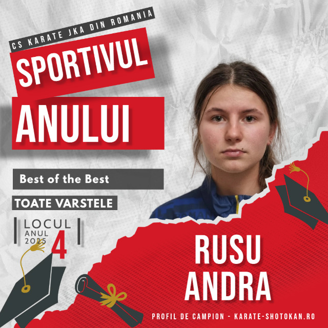 Anul competițional 2025 a reconfirmat evoluția și dedicația Rusu Andra, sportivă a CS Karate JKA România, care a fost evidențiată în categoria Best of the Best, ocupând locul IV în clasamentul final Sportivul Anului 2025, realizat pe baza punctajelor obținute în Top 100 – Sportivul Anului.