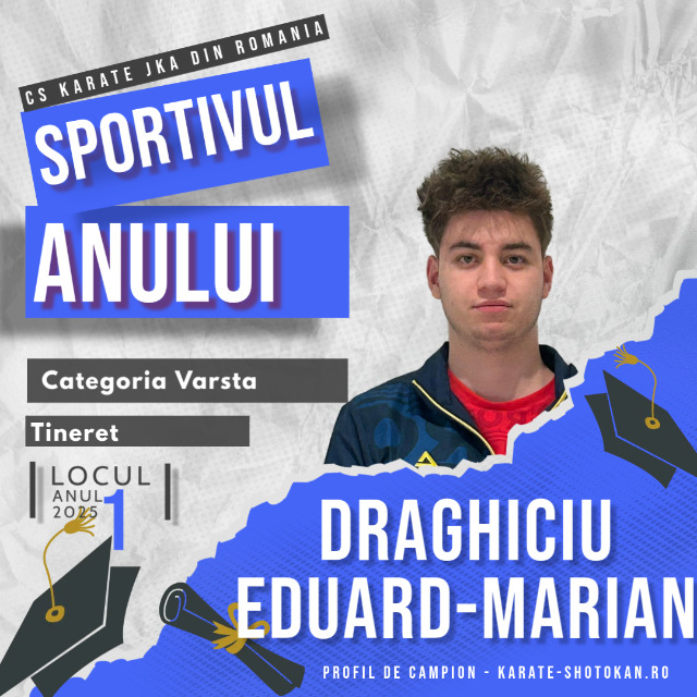 Anul competițional 2025 a consacrat performanța și dedicarea Drăghiciu Eduard Marian, sportiv al CS Karate JKA România, care a fost evidențiat în categoria 18-20 ani, ocupând locul I în clasamentul final Sportivul Anului 2025.